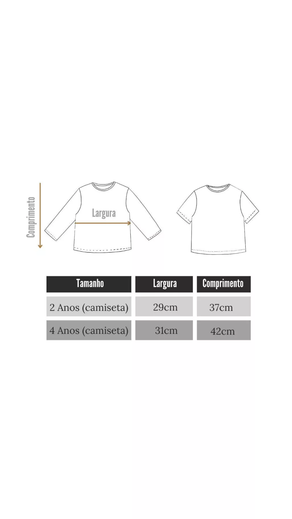 4 anos (camiseta): 30cm de largura e 42cm de comprimento